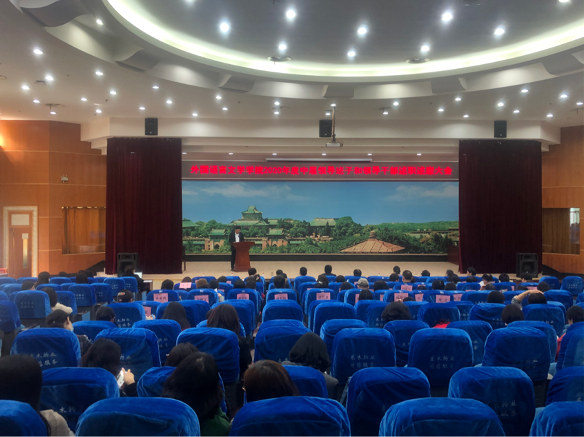 2021年3月25日外国语言文学学院2020年度中层领导班子和领导干部述职述廉大会在学院一楼报告厅举行。本次会议由黄宏发书记主持,组织部闵杰主任、学院全体教职工参加了本次会议。