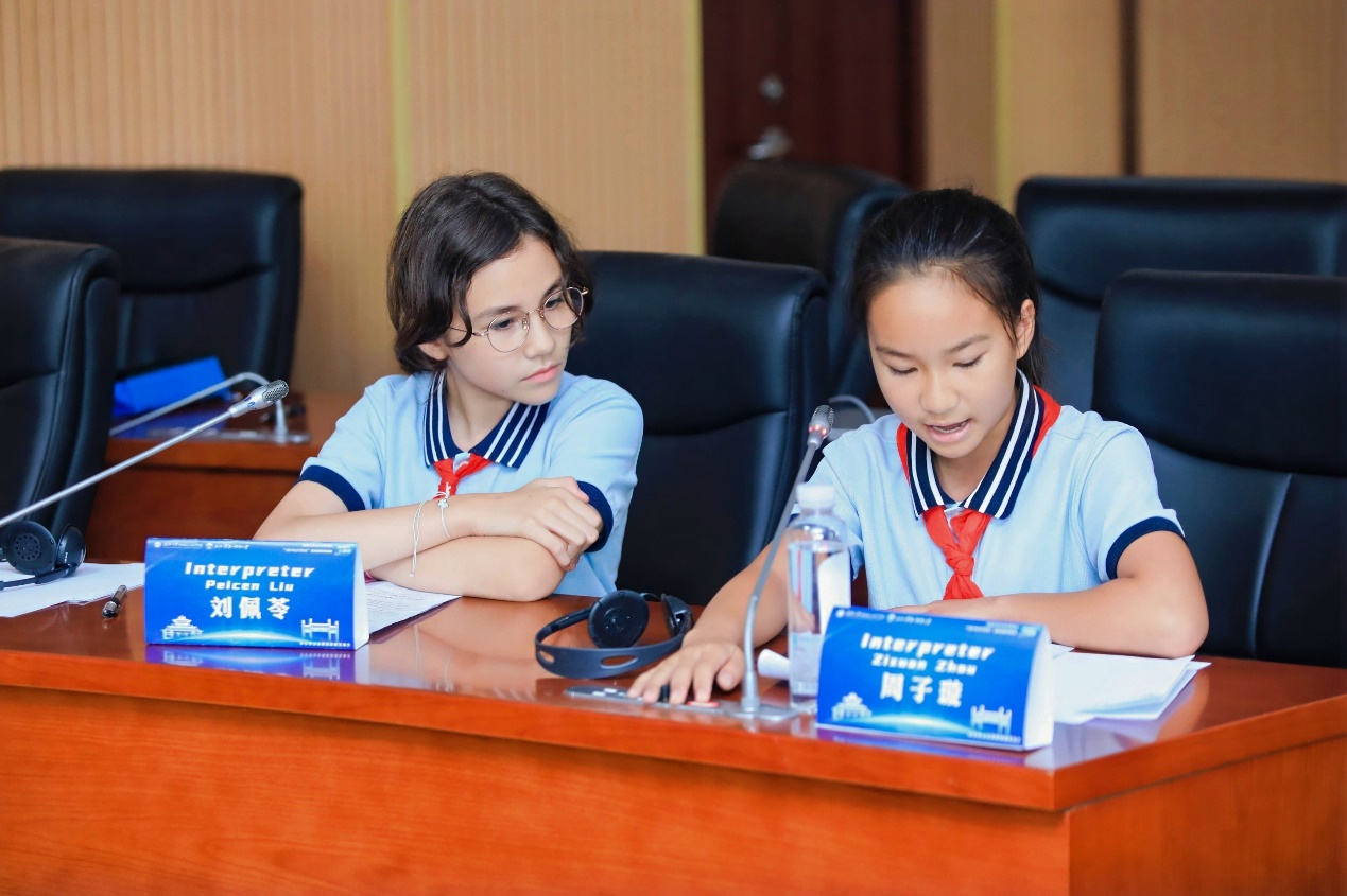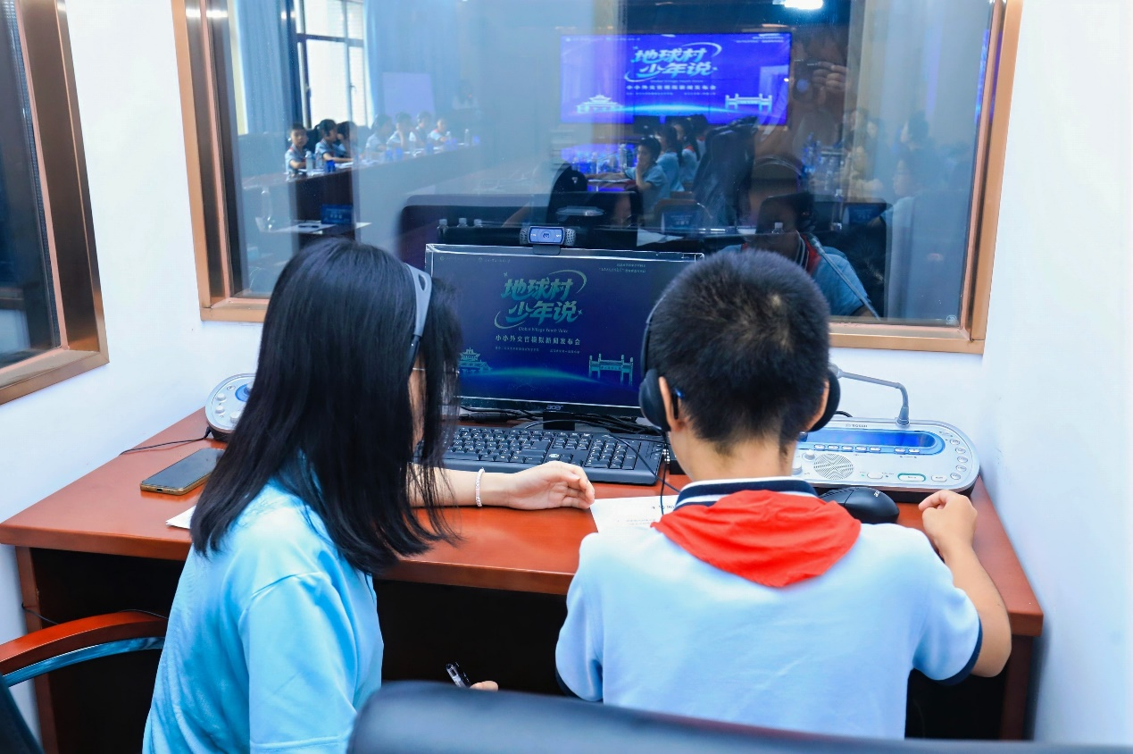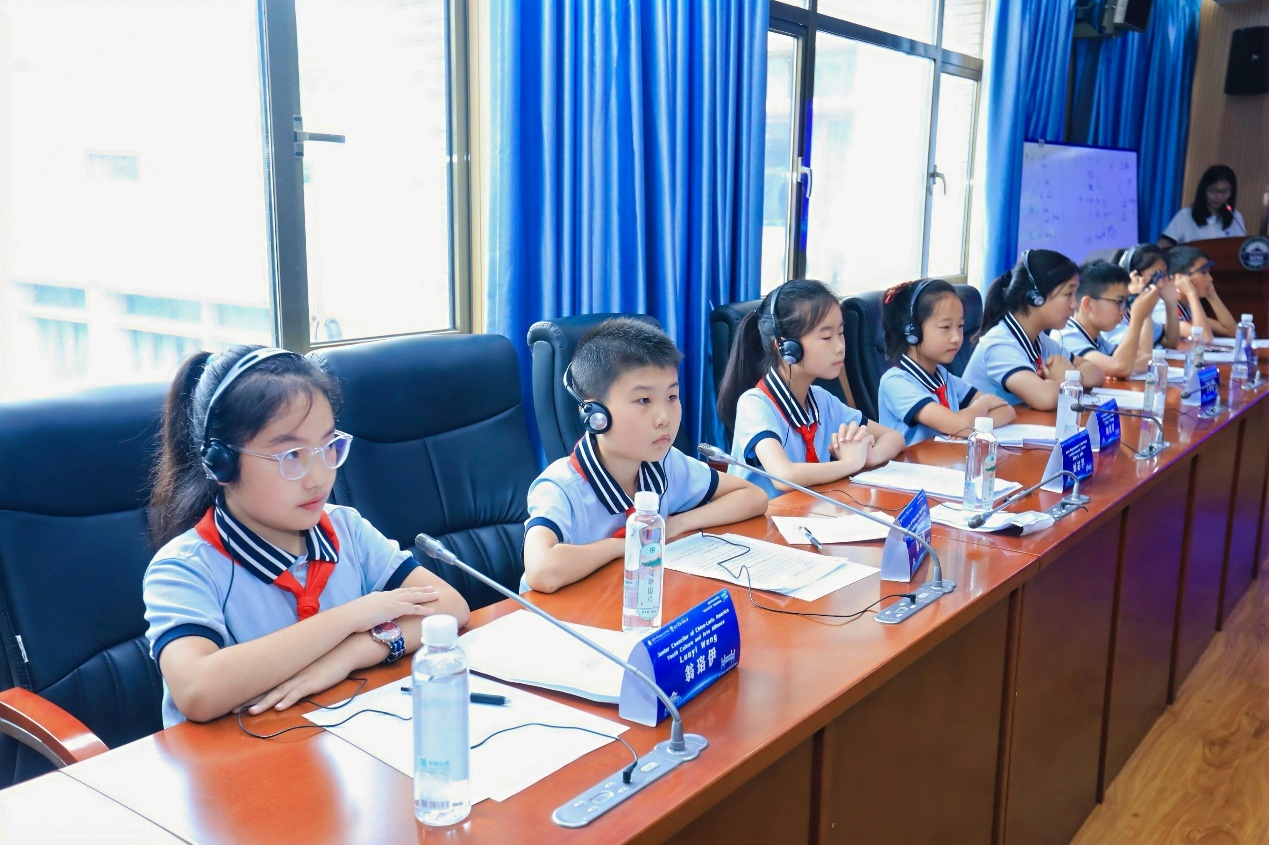 在随后的“同传体验”环节,小学生们分组进入同传厢,利用实验室先进的同传设备,尝试进行实时同声传译。这一环节让同学们亲身体验了外交场合即时语言转换的挑战与魅力,加深了对口译工作的理解。