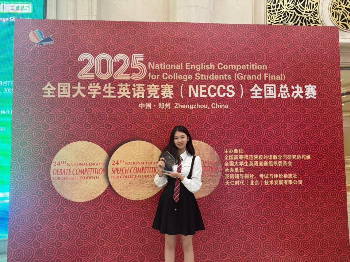 2025年全国大学生英语竞赛(NECCS)全国总决赛于8月2日—7日在河南省郑州市举行。我院英文系2023级本科生王靖颐凭借扎实的英语专业功底、充足的知识储备和出色的临场反应,取得了全国特等奖的优异成绩。