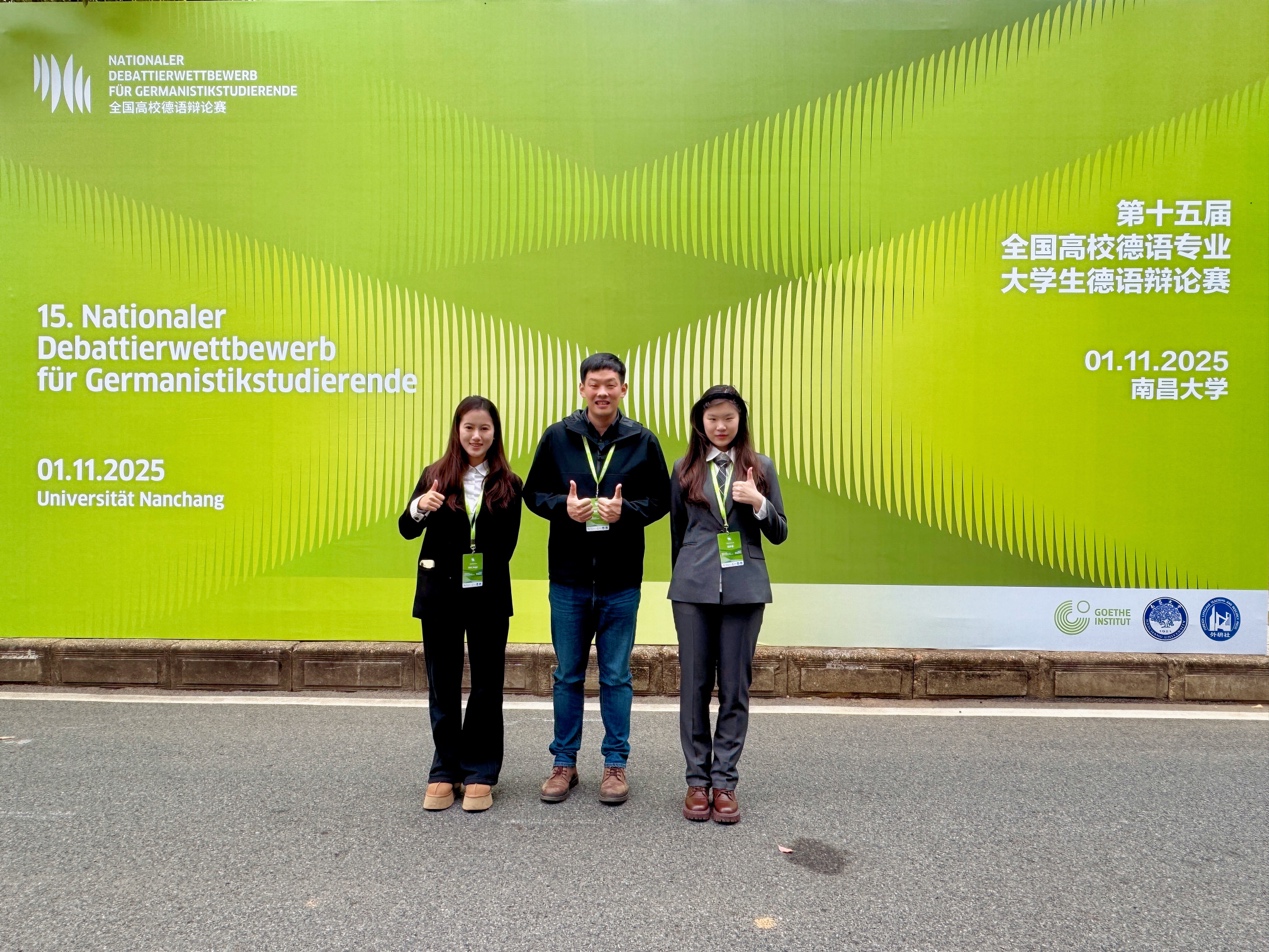 (通讯员:吴妙涵、张申威)2025年11月1日,第十五届全国高校德语专业大学生德语辩论赛决赛在南昌大学圆满落幕。我院德文系选派2023级本科生吴妙涵和2025级本科生牟景祺组队参赛,由张申威老师担任指导教师。两位同学经过初赛和决赛的比拼,最终斩获全国三等奖。