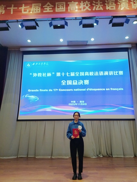 这份沉甸甸的荣誉背后,是参赛学生的不懈努力和老师们的辛苦付出。在苏昉和姜俊钦两位老师的精心指导下,张瑞同学从主题解读、稿件打磨到演讲技巧、仪态管理,进行反复演练和持续优化,最终闯入总决赛。她的出色表现充分彰显了法语学子扎实的专业素养、卓越的综合能力和积极向上的精神风貌。